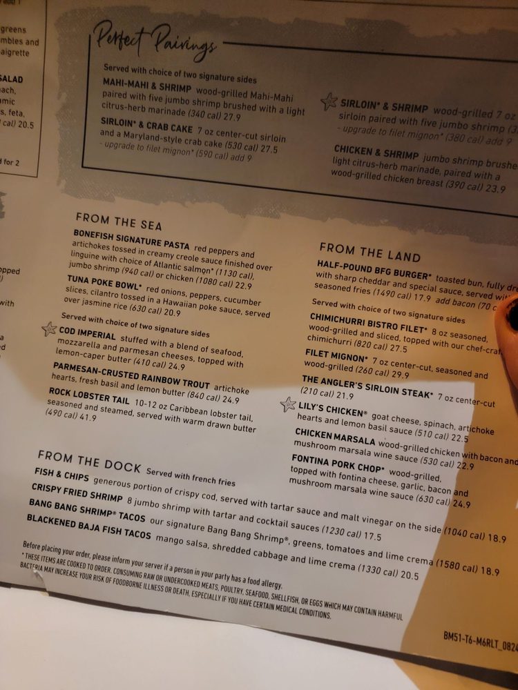 Bonefish Grill specializes in offering a wide array of seafood delights that promise to tantalize your taste buds. Highlights include the Cod Imperial Shrimp, a splendid dish featuring scallops, parmesan, mozzarella, and a luscious lemon-caper butter, served alongside jasmine rice and asparagus, priced at $28.50. Additionally, the Grilled Scallops & Shrimp make for a perfect choice, drizzled in lemon butter with freshness from seasonal vegetables, at $31.50. If you're in the mood for something classic, their Fish & Chips, featuring crispy cod with a side of tartar and cocktail sauces, is a must-try at $21.90.